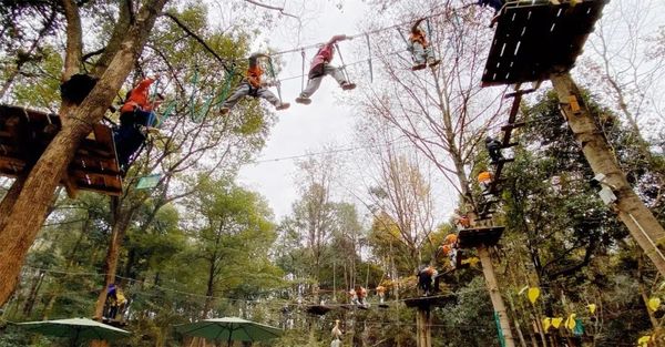 空中有法国原装引进的飞越丛林探险乐园,汇集了不同年龄层次的休 闲项目。大明山庄承接散客休闲、单位活动、水陆空团建、宴席聚会、 亲子研学等活动